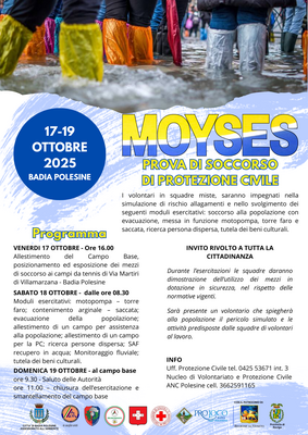 I prossimi 17, 18 e 19 ottobre si svolgerà sul territorio comunale di Badia Polesine una Prova di Soccorso denominata MOYSES. Come previsto dal Piano di Protezione Civile le esercitazioni sono un momento di verifica e simulazione per prepararsi in situazioni di emergenza come negli ultimi anni si è verificato sempre più spesso.