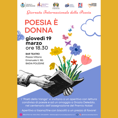 In occasione della Giornata Internazionale della Poesia, la Biblioteca Civica "G.G. Bronziero" di Badia Polesine, insieme al gruppo dei Poeti della Vanga, invita la cittadinanza a partecipare a “Poesia è Donna”, un aperitivo poetico all’insegna della condivisione, dell’ascolto e della voce femminile nella letteratura.
