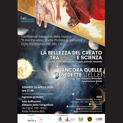 La Biblioteca Civica “G. G. Bronziero” di Badia Polesine è lieta di presentare le conferenze inaugurali della mostra “Il mio Paradiso. Dante profeta di speranza”, in programma venerdì 24 aprile 2026 alle ore 21.00 presso la Sala Soffiantini dell’Abbazia della Vangadizza.
