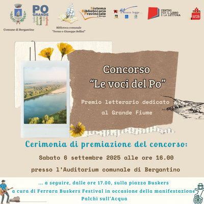 Proseguiremo poi, nella giornata di Sabato 06 settembre 2025, con la premiazione del concorso letterario "Le voci del Po" - Premio letterario dedicato al Grande Fiume, promosso dalla nostra biblioteca e inserito nel progetto vincitore "Nuovo sprint alla lettura" finanziato da CEPELL - Centro per il Libro e la Lettura.