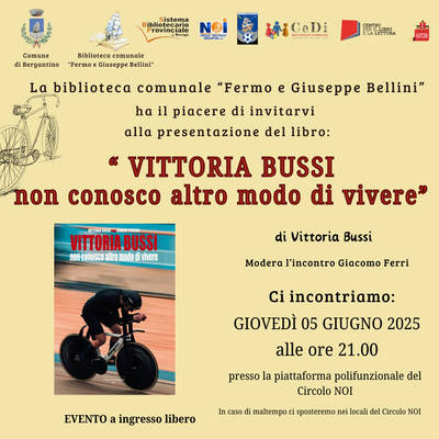 Verrà perciò a presentarci il suo libro dal titolo: "Vittoria Bussi non conosco altro modo di vivere" dialogando con Giacomo Ferri appassionato ciclista, perciò chi meglio di lui può accompagnarci alla scoperta di questa straordinaria donna.