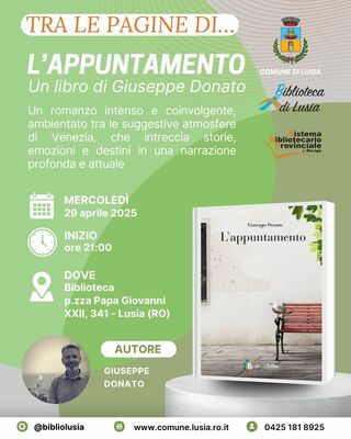 Mercoledì 29 aprile 2025 alle ore 21:00, presso la Biblioteca Comunale di Lusia (P.zza Papa Giovanni XXII, 341), si terrà la presentazione del romanzo “L’appuntamento” di Giuseppe Donato.